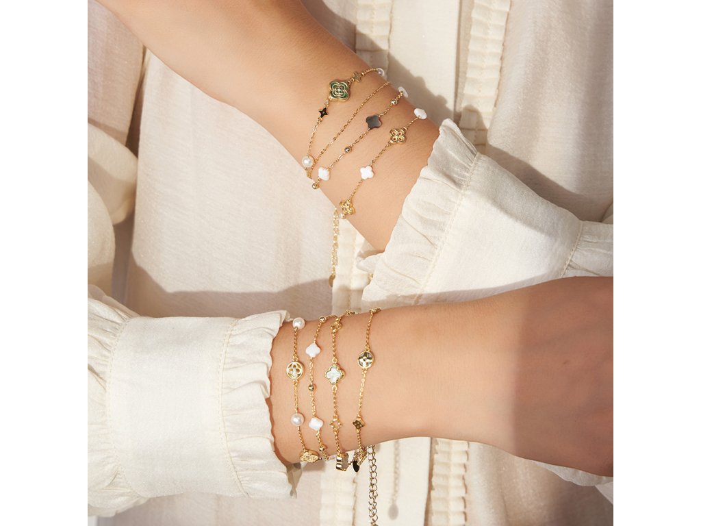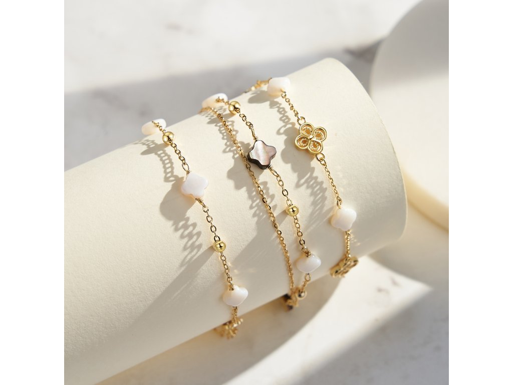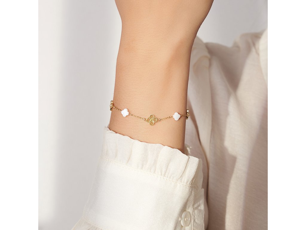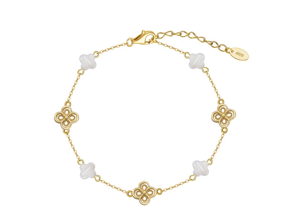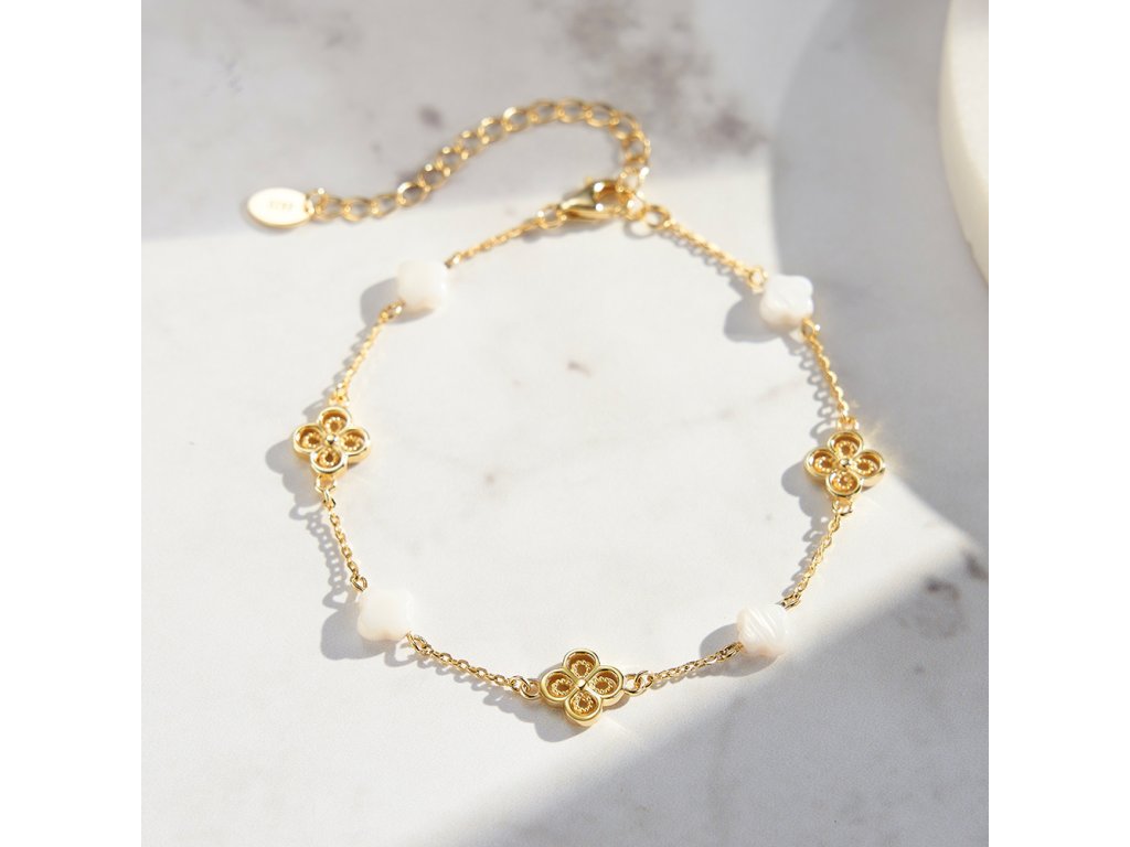 Obľúbený kvetinkový motív sa dostáva aj do našej kolekcie strieborných náramkov. Náramok Charmy z kvalitného striebra 925/1000 zdobia aj prívesky z prírodnej mušle.